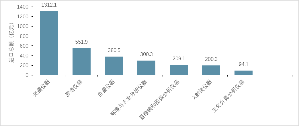 2019-2023五年期间,我国科研仪器进口额位于前列的仪器种类分别是光谱仪器、质谱仪器、色谱仪器、环境与农业分析仪器、显微镜及图像分析仪器、X射线仪器、生化分离分析仪器,这七类仪器的进口经费金额占科研仪器总进口额的30%以上。